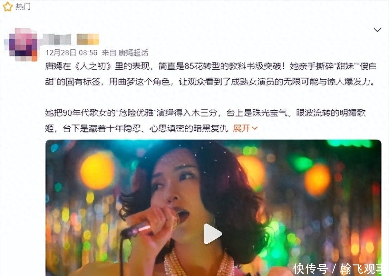 26. 有人质疑:“42岁的她出演90年代当红歌女是否违和?” 立刻遭到粉丝反击:“这个年纪还能如此投入拼命,你行你来试试?从《繁花》到《人之初》,进步有目共睹。”